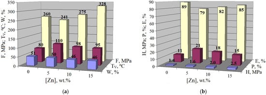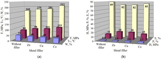 In addition to swelling ability, the obtained metal-filled pHEMA-gr-PVP copolymers have relatively high strength, elastic characteristics, and heat resistance (Figure 3). Synthesized polymers can be operated in two phase states—solid (dry) and elastic (hydrogel in a swollen state)—and properties were studied for dry (Figure 3a) and hydrated (Figure 3b) samples, respectively. Dry samples were studied for surface hardness (F, MPa), water content (W, %), and Vick heat resistance (TV), while swollen ones were studied for hardness, elasticity, and plasticity, which were characterized, respectively, by the hardness number (H, MPa), elasticity number (E, %), and plasticity number (P, %).