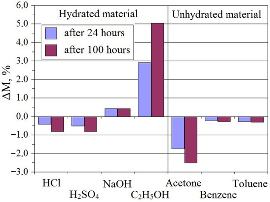 The spatially cross-linked structure of the obtained pHEMA-gr-PVP copolymers provides them with resistance to aggressive media. The study of chemical resistance provides interest in terms of a definition of one of the technical characteristics of the developed materials. The chemical resistance of materials was studied by the change in the mass of the samples (ΔM, %) after their exposure to aggressive media of various nature. The 0.1 N solutions of HCl, H2SO4, and NaOH, as well as ethanol, acetone, benzene, and toluene, were selected as aggressive media (Figure 5). As can be seen from the obtained results, the mass of material samples in a hydrated state changes slightly in acid and alkali solutions, i.e., the material is chemically resistant to these media. In the acidic medium, mass loss in samples and a change in color from yellow to transparent colorlessness is observed. Color loss indicates the destruction of the complex through charge transfer [57] between HEMA and PVP, and mass loss indicates the release of unreacted physically bound components (HEMA, PVP) that resided in the structure of the complexes. Holding the sample in an alkaline medium causes an increase in its mass, which can be explained by the destruction of physical nodes, which increases the swelling degree of the copolymer. A significant increase in the mass of the material in the C2H5OH medium occurs as a result of intense hydrophobic–hydrophilic interaction with macromolecules due to hydrogen bonds.
