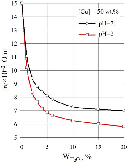 With an increase in the amount of metal, the specific resistance of the composites decreases intensively up to a filler content of 50 wt.%, after which a slight change in ρV is observed (Figure 6b). It is important to note that increases in the content of fillers of different nature have a different effect in terms of magnitude on their electrical conductivity (specific resistance). However, a limit exists for the maximum content of each filler in the composition in terms of the point at which the composition still retains fluidity. A further increase in the filler amount makes the composition non-technological, causing difficulties for the removal of air and filling of the forming cavity of the mold.