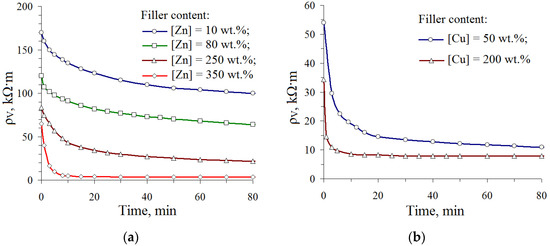 Kinetics of change in the ρV of Zn-filled (a) and Cu-filled (b) hydrogels in an acidic medium (HEMA:PVP = 80:20 mass parts; pH = 2).