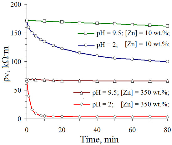 Kinetics of change in the ρV of Zn-filled hydrogels depending on the pH medium (HEMA:PVP = 80:20 mass parts).