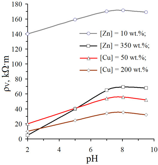 Samples filled with zinc are characterized by greater resistance stability during exposure in an alkaline medium compared to an acidic one. The nature of the curves does not change with increasing filler content. It was established that the synthesized copolymers are sensitive to changes in pH in the range of pH = 2–7 (Figure 10), and the change in ρV resulting from the change in pH significantly depends on the nature and content of the filler.