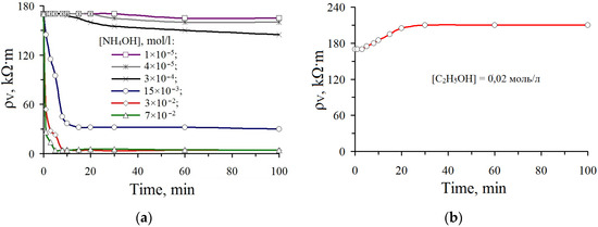 Using the example of ammonia solution (Figure 11a) and ethanol (Figure 11b), the nature of the change in the volume electrical resistance of metal-filled pHEMA-gr-PVP copolymers depending on the residence time in the mentioned environments was studied. For the zinc-filled copolymer, a noticeable change in electrical conductivity is observed during the sorption of low molecular weight substances.