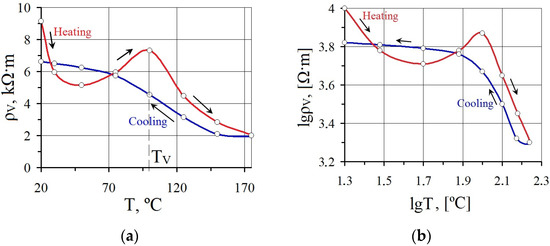 Effect of temperature on the change in the electrical resistance of Co-filled copolymers (a) and logarithmic (b) dependence lgρV = f(lgT) (HEMA:PVP = 70:30 mass parts, [Co] = 200 wt.%).