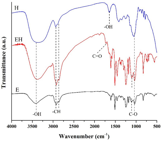 In the region from At 1245 cm−1, 1184 cm−1, 1107 cm−1 and 1033 cm−1, C–O stretching vibrations were observed in the spectra of E and EH3 [41,42,43]. The H sample had only two peaks in that range, at 1252 cm−1 and 1052 cm−1, C–O stretching from C–OH, characteristic for fructose and glucose carbohydrates. The absence of a band around 1185 cm−1 proved that our H sample did not contain sucrose [39]. Out-of-plane –CH bending was observed in all three spectra in the region 916–697 cm−1 [44,45,46]. Stronger peaks in EH3 indicate the presence of carbohydrates [47].