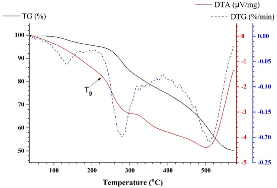 In order to investigate the thermal stability of epoxy modified using acacia honey, simultaneous thermal analysis was performed in the air. Following the assumptions made by structural and morphological analyses, structures formed during processing should have resulted in bio-modified epoxy resin with high thermal stability. The curves obtained from TGA-DTG-DTA for the most representative sample, EH3, are presented in Figure 5. The TGA curve of EH3 showed a weight loss of 2.7% in the region around 35–165 °C, which indicates a very low presence of water and unreacted compounds with a low boiling point [48]. A small DTG peak was detected at 133 °C in this region. The degradation of epoxy moiety due to thermal oxidation reactions that involve chain scission was observed in two stages [45]. The first stage was from 165 °C to 390 °C, with a strong DTG peak at 279 °C, which is in accordance with the literature and our previous investigation on epoxy thermal stability [49,50]. Weight loss in this region was 22%, which corresponds to a minor endothermic peak at DTA.