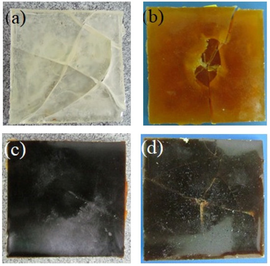 Photographs of: (a) E, (b) EH1, (c) EH3, and (d) EH6 after the first impact.