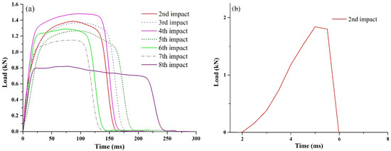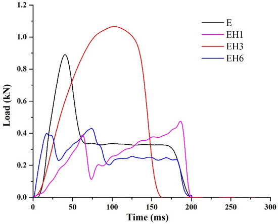 Load-time curves from controlled energy impact test for (a) EH3 and (b) EH6.