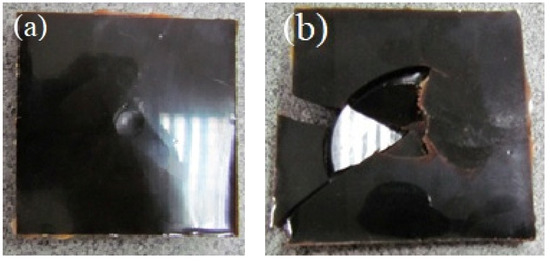 Figure 6 shows photographs of E, EH1, EH3, and EH6 after the first impact, while corresponding load-time curves obtained from the controlled energy impact test can be seen in Figure 7. The surface of EH6 (Figure 6d) was covered with discontinuous pores as a consequence of increased phase separation in bio-modified resin. Unmodified epoxy showed typical ductile failure because full cross-linking could not be achieved without high-temperature post-curing [40]. After the first impact, samples E and EH1 were completely destroyed. On the other hand, it can be seen that EH3 was barely damaged after the first impact, while EH6 was damaged but not completely destroyed. Furthermore, EH3 showed more brittle-ductile failure, which is in accordance with thermal analysis that indicated the existence of a rigid condensed structure, compared to the ductile failure of room-temperature cured E, which showed poor thermal stability. This occurrence lead to performing series of impacts in order to establish the impact resistance potential of EH3.