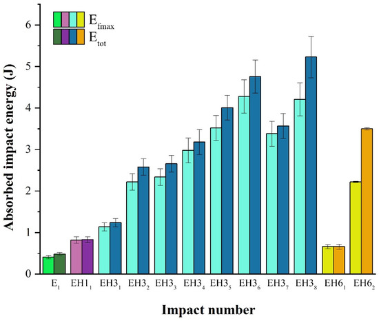 Figure 9 represents load-time curves from the second to eighth impact of EH3 (Figure 9a) and the second impact of EH6 (Figure 9b). Efmax and Etot for all the samples are presented in Figure 10. During the first impact, E absorbed 0.48 J with the failure of the material, which is consistent with the low toughness of neat epoxy observed on FESEM images [32]. EH1 showed a transition from ductile to brittle failure, with approximately two times higher absorbed energy than E, while EH3 absorbed around 2.5 times more energy with barely visible damage. EH6 showed weaker toughness compared to EH1 and EH3, absorbing 0.66 J. However, unlike EH1, it was not completely broken after the first impact.