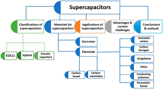 This study is developed on the findings of earlier investigations into this intriguing subject [26,27,28,29]. It is pertinent to previous studies because it addresses the past, the present, and the future. In addition, the review highlights the emerging achievements and recognizes the technical areas of challenges. Various types of supercapacitors are also provided. This report examines different electrode materials used to make SCs, including carbon-based, transition metal oxide, conjugated polymers, and perovskite-based materials. Extensive discussion is given to the significance and process of selecting an electrolyte. The potential benefits, advantages, and disadvantages, as well as areas for future studies, are provided in this study. Figure 1 illustrates the structure of the study.