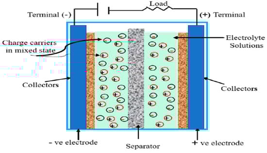 From a technical point of view, a supercapacitor has two distinct benefits over an ordinary capacitor. The first is its larger surface area due to the porosity of the plates. The second is the small distance between the two plates, which supports the Angstrom unit, in comparison to the electrodes in a regular capacitor [45]. For instance, in supercapacitors, the large surface areas emanating from coating powders, e.g., activated charcoal, improve storage capacity; while in a standard capacitor, the insulator between the plates can be transformed in an electric field, referred to as dielectric. Examples of dielectric materials are mica and thin plastic/polymeric films. The positive charges at the capacitor’s charge awaken one plate, while the negative charges form a current. Consequently, the dielectric and ions that support it polarize in the field that is directed in the opposite direction, lessening their power which is accountable for storing charges on the plates in minimum voltage [26,45].