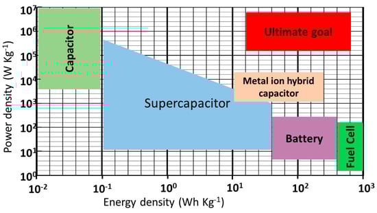 Figure 3 highlights the performance analysis of storage devices—the batteries, capacitors, supercapacitors, and fuel cells—in terms of power density in the vertical direction (Wkg−1) and energy density in the horizontal direction (Wh kg−1). As observed in Figure 3, the capacitor has the highest power density with low energy density, while the fuel cells have the highest energy density with low power density. Furthermore, supercapacitors fill the gap between capacitors and batteries, making them noticeable among energy storage systems. The Ragone plot is employed to assess the energy storage performance (energy and power densities), which is crucial in deciding electrolytic supercapacitors’ functionality [48]. The best device choice should have high power and energy densities [49]. Other essential elements, such as cycle life, cost estimation, etc., are considered when analyzing the energy storage technology performance [49].