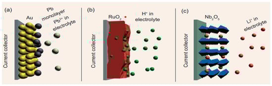 The three processes that lead to pseudocapacitance are (a) underpotential deposition (b) redox pseudocapacitance and (c) intercalation pseudocapacitance, as shown in Figure 5 [74].