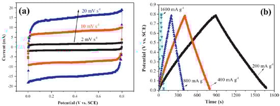 An excellent alternative to RuO2 is manganese dioxide (MnO2). This is due to its affordability and superb electrical properties [170,171,172]. Typically, Na2SO4 electrolytes are used to investigate MnO2′s capacitance characteristics. The electrodeposited MnO2 has a beneficial effect, and it boosts the material’s pseudocapacitance, owing to its swift Faradaic and reversible charge transfer processes [170,171]. Figure 7 shows the rectangular CV and the linearity of the galvanostatic charge/discharge (GCD) profile, which shows that the material has quick and reversible characteristics and good cyclic durability. The theoretical value of the specific capacitance of MnO2 is 1100 Fg−1. However, the practical results show that this value is only one-fifth as high [173,174,175,176]. Crystallographic and morphological factors, obtained through the experimental results, caused the poor specific capacitance.