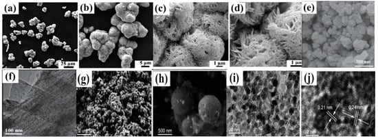 Images of the NiO samples produced through a hydrothermal technique with SDBS as an additive, (a–d). Adapted with permission from [187]; ©2011 J. Mater Chem. (e) SEM and (f) HRTEM. Reproduced from [183]. © 2014, Mater letter. (g,h) at various magnifications and TEM (i) and HRTEM (j) images of NiO samples synthesized via porous carbon nanospheres as a hard template. Adapted with permission from [183]. ©2014, Mater letter.