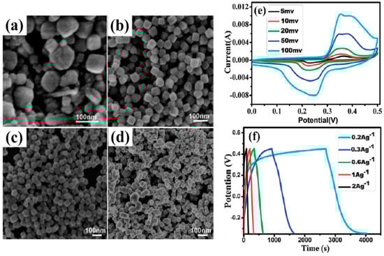 SEM images of Co3O4 samples after the addition of various amounts of mesoporous carbon nanorods: (a) 0 mgmL1; (b) 0.0175 mgmL1; (c) 0.025 mgmL1; (d) 0.05 mgmL1. (e) CV curves of the mesoporous Co3O4 nanocube electrode at different scan rates. (f) GCD curves of the as-prepared electrode at various current densities. Reproduced with permission from [194]. ©2013, Nanoscale.