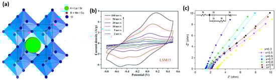 - Cao, Y.; Lin, B.; Sun, Y.; Yang, H.; Zhang, X. Structure, morphology and electrochemical properties of LaxSr1−xCo0.1Mn0.9O3-δ perovskite nanofibers prepared by electrospinning method. J Alloys Compd. 2015, 624, 31–39. [Google Scholar] [CrossRef]