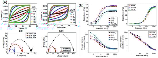 Interestingly, commercial EDLCs mostly make an electrical double layer of ions from the electrolyte on the top layer of porous electrodes to produce their double-layered capacitance energy storage. The EDLCs’ charge/discharge is high, and their life span is more significant than one million cycles since they are not restricted by the electrochemical electron flow dynamics of batteries [60]. These commercial EDLCs are constructed with two parallel electrodes coated with tetraethyl ammonium tetrafluoroborate compound electrolytes in organic solvents. The organic electrolyte EDLC operates at 2.7 V and produces energy densities between 5–8 Wh/kg and 7–10 Wh/ℓ. The electrode’s operating voltage and specific capacitance (Sc) determine the EDLC energy density. The specific capacitance is proportional to the electrolyte’s Specific Surface Area (SSA), interstitial double-layered capacitance, and the thickness of the electrode substance. Using a specific surface-area-blocking and electrically conducting material enhances high capacitance. Graphitic carbon is an exciting prospect that meets this requirement. The characteristics are: good conductivity, electrochemical endurance, and permeability [61]. High SSA and low cost are the reasons why activated carbon is widely embraced for this purpose [62,63]. Aqueous electrolytes have a greater double-layer capacitance (150–300 Fg−1) than organic electrolytes (100–120 Fg−1) at low cell voltages because water dissolution limits the electrolyte voltage range. The variations in CV at different scan rates in EDLC have been documented [64,65].