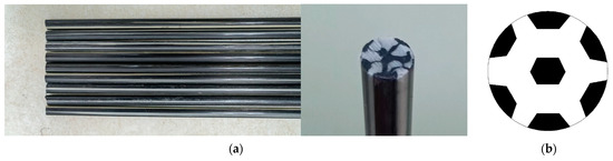 Through fiber hybrid methods, C/GFRP rods were prepared using continuous pultrusion equipment (Harbin FRP Institute, Harbin, China). The diameter of the hybrid rods was 7 mm, and the rods produced could be up to several thousand meters long, the rods used in the experiment were obtained by cutting, as shown in Figure 1a. The detailed fiber distribution is shown in Figure 1b, the black areas represent carbon fiber and the white areas represent fiberglass. T700 carbon fiber (12K), Owens corning glass fiber (OC 2400tex), and anhydride-type epoxy resin matrix were used for the production of C/GFRP rods. The volume fraction of the fiber was about 70%, the volume fraction of the carbon fiber was 0.32. The detailed mechanical performances of fiber and matrix are list in Table 1.