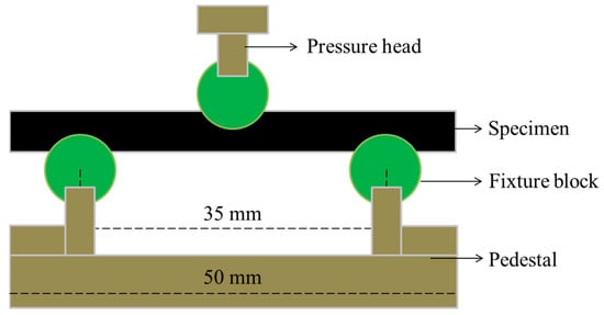 The short-beam shear strength (SBSS) of the C/GFRP rods was calculated according to ASTM D4475. The hybrid rod was cut to 50 mm for the short-beam shear test samples and the span was 35 mm (five times the diameter of the rod). The universal testing machine (Shanghai LE5105 Precision Instrument Co., Ltd., Shanghai, China) was used to obtain the short-beam shear strength. The detailed short-beam shear test device diagram for C/GFRP rods is shown in Figure 2, where the displacement control is adopted. The displacement speed was set at 1.3 mm/min, and five samples were tested in each condition to obtain the average. The short-beam shear test for aging was carried out at intervals of 30, 90, 180, and 360 days on samples exposed to water.