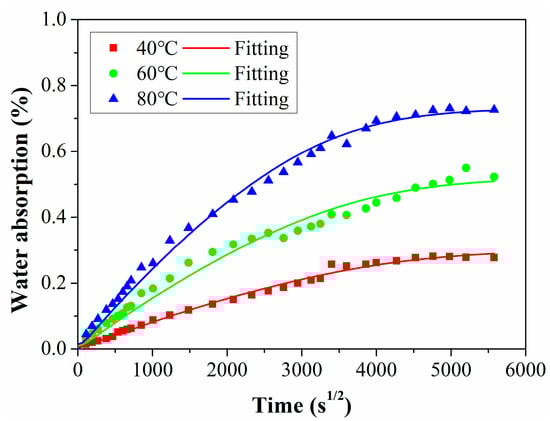 Water absorption curves immersed in distilled water at 40 °C, 60 °C, and 80 °C.