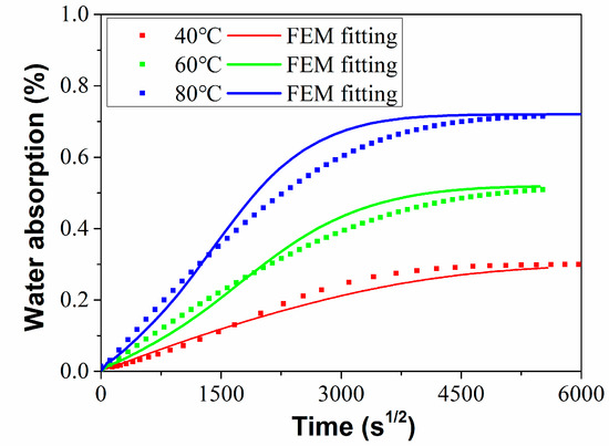 To further analyze the diffusion process of the water molecules in C/GFRP rods, the finite element model (FEM) was established using ABAQUS software. The process of water absorption in the ABAQUS finite element software was simulated using the mass diffusion module. The material parameters in Table 1 were input into the model to obtain the water absorption curves, which were compared with the experimental test results, as shown in Figure 5. It can be found that the simulation results fitted well with the experimental results, which proved the correctness of the finite element model for water absorption.
