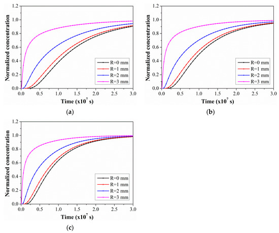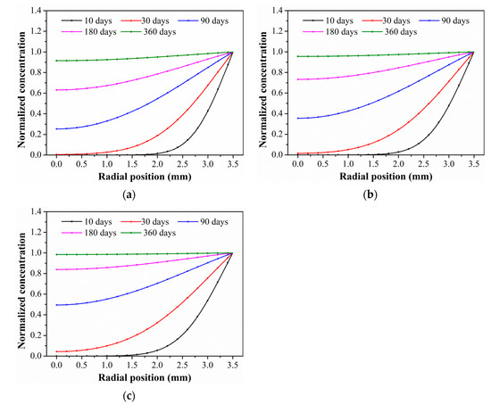 Based on Equation (5), the water absorption concentration distribution of the C/GFRP rod was obtained as a function of the radial position, immersion time, and temperature. Figure 6 shows the radial distribution curve of the absorption concentration of the C/GFRP rod immersed at 40 °C, 60 °C, and 80 °C. The absorption concentration of the C/GFRP rod increased greatly with the exposure temperature, especially in the early stage of exposure. The main reason was that the diffusion rate of water molecules along the radial direction of the C/GFRP rod increased up at a higher temperature. Additionally, the water absorption concentration increased with the increase in radial position. Furthermore, the saturated water absorption of the C/GFRP rod was higher than 360 days at 40 °C and 60 °C, and about 360 days at 80 °C. Therefore, for saturated water absorption at the same radial position, the exposure temperature was a key factor for the saturated water absorption time.