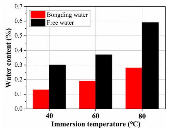 In order to clarify the quantitative effect of temperature on water content, the relationship between free water content, bonding water content, and exposure temperature was established, as shown in Figure 9. It can be concluded that the content of free water diffusion in the C/GFRP rod was about twice as much as that of the bonding water for the three exposure temperatures. This suggests that most of the water molecules in the C/GFRP rod were in a free state, which played a role in lubricating the polymer chain of the resin matrix. In contrast, bonding water was the key factor causing the hygrothermal aging of the C/GFRP rods. This was because the water molecules existing in the state of bonding water would break the three-dimensional cross-linking between the resin chains in the form of a hydrogen bond with the resin matrix, resulting in the decomposition of the resin matrix chain and debonding of the fiber–resin interface. In summary, the content of free and bonding water increased linearly with the exposure temperature, with the slope of free water being greater than that of the bonding water, because the procedure for bonding water was harder to perform than for free water.