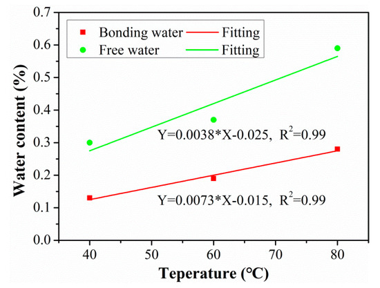 Relationships between the free water content, bonding water content, and exposure temperature.