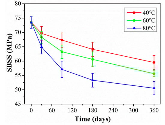 Figure 10 shows the SBSS of C/GFRP rods exposed to distilled water for 360 days at 40 °C, 60 °C, and 80 °C. It was found that the SBSS of C/GFRP decreased with exposure time, especially for 80 °C. For example, compared with the SBSS (73.1 MPa) of the control C/GFRP, the SBSS after 360 days of exposure decreased by 14.7% for 40 °C, 21.3% for 60 °C, and 29.4% for 80 °C. The decrease in SBSS can be attributed to the fact that water molecules bonded with the resin matrix through hydrogen bonding to form two kinds of bonded water, which resulted in the plasticization and hydrolysis of the resin matrix and fiber–resin interface debonding, causing a decrease in fiber–resin interface shear strength. Additionally, it was noted that the SBSS degradation rate of C/GFRP rods was fast during the initial stage of exposure, because water molecules interacted with the resin matrix, resulting in plasticization of the resin matrix. During the middle and late stages of exposure, the degradation rate of SBSS became slow, because the water absorption of C/GFRP rods reached saturation. For the same exposure time, the decrease in shear strength was significantly accelerated by temperature. Therefore, exposure temperature was the main factor affecting the interfacial strength of C/GFRP rods.