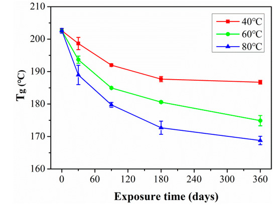 (3) After 360 days of exposure, the Tg of the C/GFRP rods decreased by 6.9% (40 °C), 13.3% (60 °C), and 17.4% (80 °C), respectively, because the ingression of water molecules led to degradation in the viscoelastic behavior of C/GFRP rods.