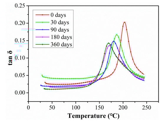 Figure 12 shows the changes in tanδ curves of C/GFRP rods with aging time under the exposure condition of 80 °C. Previous studies [34,35] have shown that there was a linear relationship between the horizontal crosslinking of the resin matrix and loss tangent profile; that is, the increase in loss tangent profile indicated the improvement in the horizontal crosslinking of the resin matrix. As shown in Figure 12, the curve peak of tanδ decreased with exposure time from 30 days to 360 days compared with the unaged sample, especially during the initial stage. This was because the ingression of water molecules in the initial stage led to significant resin plasticization, which reduced the cross-linking density between the molecular chains and then decreased the damping property of the resin matrix. Additionally, the ingression of a large number of water molecules into C/GFRP rods led to obvious interfacial debonding, which reduced the restriction of the interface on the molecular chain of the resin matrix, and greatly improved the freedom of movement of the molecular chain and the damping performance of the resin matrix. In addition, the horizontal axis of the tanδ peak shifted to the left after prolonged exposure, indicating Tg degradation in the C/GFRP rods.