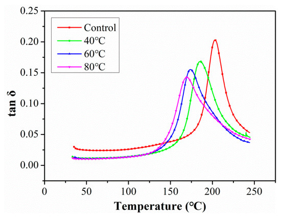 After 360 days of exposure, the changes in tanδ curves according to exposure temperature are shown in Figure 13. It was found that exposure temperature had a significant effect on the peak of the tanδ curve, especially in the 80 °C immersion environment. This was because the C/GFRP rods reached saturation after exposure for 360 days at all of the immersion temperatures, and the fiber–resin interface underwent severe degradation under high temperature immersion conditions. Furthermore, the horizontal coordinate of the peak tanδ gradually shifted to the left with exposure temperature, which again suggested that the elevated temperature increased with the decrease in Tg.