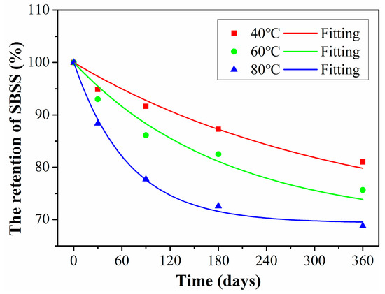 Furthermore, the nonlinear fit with Equation (8) can be used to obtain the long-term prediction results of hybrid rods according to the related research [38], the fitted curves of SBSS at three exposure temperatures were obtained, as shown in Figure 15 and the fitted parameters are shown in Table 5. It was found to be well fitted between the fitting curve and the experimental data, which indicates that the degradation of SBSS satisfied the Arrhenius acceleration theory. In addition, the fitted parameter of τ decreased with exposure temperature, which indicates the exposure temperature had a significant effect on the SBSS degradation rate.