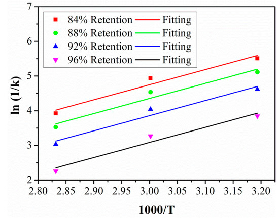 In order to obtain the TSF between the laboratory aging temperature and the actual service temperature, the activation energy Ea for SBSS degradation should be obtained first. Furthermore, by transforming Equation (6) into Equation (9), and then placing the fitted parameters τ and Y∞ into Equation (9), time t can be obtained when SBSS reached 84%, 88%, 92%, and 96% retention at 40 °C, 60 °C, and 80 °C, respectively.