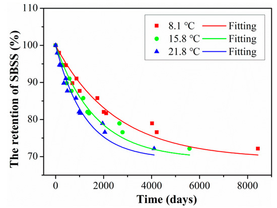 In order to quantitatively analyze the degradation rate during the initial exposure of the hybrid rods, the required service time for SBSS to reach 90% retention was obtained, and the detailed results are listed in Table 9. Furthermore, the service times when the retentions of SBSS decreased to 90% were 2657 days, 1758 days, and 1294 days for the exposure temperature of 8.1 °C, 15.8 °C, and 21.8 °C, respectively. It can be seen that the initial degradation rate of SBSS was increased by the service temperature.