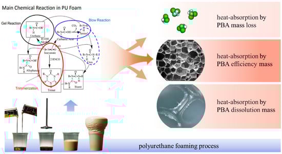 The heat absorbed per unit mass of PBA, denoted as (J·g−1), is defined by Equation (9), where is the initial PBA mass. The initial mass ratio of PBA to other mixture materials in PURF is (wt%), and is defined by Equation (10). Where (g) is the material total mass of the foaming start without PBA.