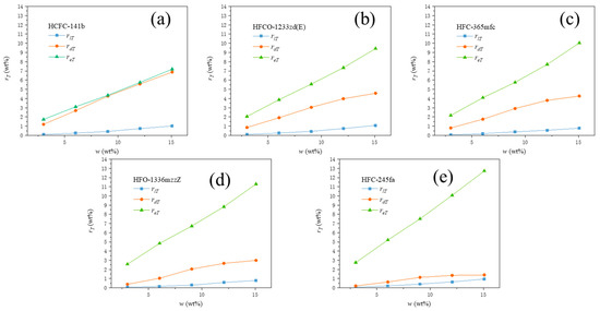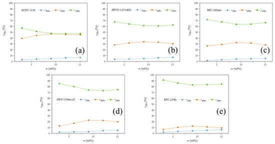 The ratios of the three states of each PBA relative to the total mass of material used, (wt%). In which the PBA systems were (a) HCFC-141b, (b) HFCO-1233zd(E), (c) HFC-365mfc, (d) HFO-1336mzzZ, and (e) HFC-245fa.