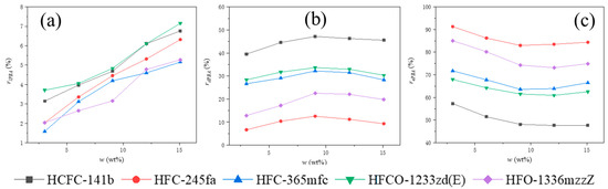 In the case of the same PBA concentration, the PBA mass efficiency rate is ranked in order from low to high: HCFC-141b, HFCO-1233zd(E), HFC-365mfc, HFO-1336mzzZ, and HFC-245fa. The order of PBA mass dissolution rate is just the opposite. The mass loss rate of the different PBAs did not show significant differences. Both the PBA mass efficiency and dissolution rate are controlled by the vaporization and condensation process of PBA. The ratio of the three states of each PBA relative to the total mass of material used, (wt%), shows a clear positive correlation with . This indicates that the concentration of PBA is the dominant controlling factor for the absolute amount of each state of PBA.