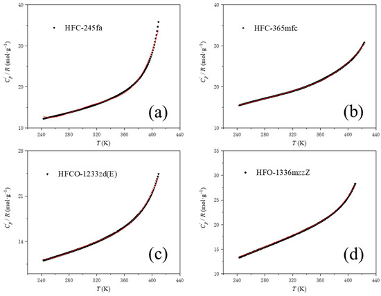 Fitting plot of the change curve of the specific heat capacity of the ideal gas with temperature of PBAs. (a) HFC-245fa data and fitted curve, (b) HFC-365mfc data and fitted curve, (c) HFCO-1233zd(E) data and fitted curve, and (d) HFO-1336mzzZ data and fitted curve. The solid red line in the figure is the fitted curve.