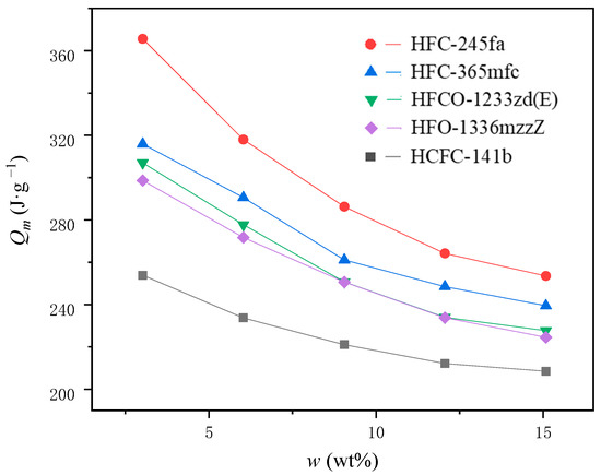 By plugging in the aforementioned parameters into Equations (8) and (9), the heat absorbed by PBA per unit mass (J·g−1) at different concentrations can be calculated, as depicted in Figure 6.