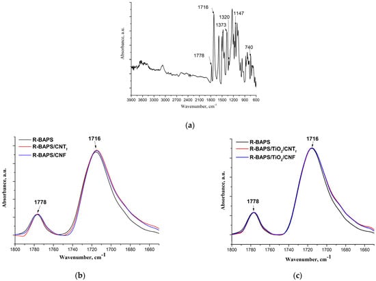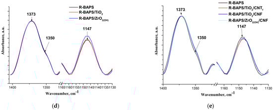 The FTIR spectrum of the pristine R-BAPS is shown in Figure 5a. The characteristic peaks of the imide rings at 1778 cm−1, 1716 cm−1 (symmetric and antisymmetric C=O stretching vibrations), 1373 cm−1 (C-N stretching vibrations) and 740 cm−1 (deformation C=O vibrations) were registered [67]. The peaks at 1350 cm−1 (a shoulder near 1373 cm−1) and 1147 cm−1 were ascribed to SO2-group vibrations. The spectra of R-BAPS-based nanocomposites (Figure 5b–e) also exhibited distinctive imide ring absorption peaks. This indicates the completion of the PI imidization process not affected by the presence of the fillers. However, some changes in the peak positions were observed. When CNTf and CNF were inserted in the R-BAPS matrix, a certain shift to the low-frequency region and widening of the bands corresponding to symmetric and antisymmetric C=O stretching vibrations of the imide cycle took place (Figure 5b), which may be attributed to the development of a network of hydrogen bonding. The shift of the same peaks in the R-BAPS/MO nanocomposites was rather small, which is likely due to the low concentration of the nanoparticles. Filling R-BAPS with binary MO/nanocarbon mixtures led to the same changes in the shapes of the bands and peak positions of C=O stretching vibrations as in the case of filling this PI with CNTf and CNF nanospecies individually (Figure 5c). The C-N and SO2-group stretching vibrations were also affected by the presence of the nanofillers. It is evident that ZrO2(OH) nanoparticles augmented the intensity of the 1147 cm−1 band, the effect of TiO2 on this band being very small (Figure 5d). Some changes in the intensities of the bands 1350 cm−1 and 1147 cm−1 along with a slight shift of the 1373 cm−1 peak to the low-frequency region were observed upon filling the R-BAPS with binary mixtures of MOs with nanocarbon (Figure 5e). Overall, all the nanofillers are proved to affect the matrix due to the formation intermolecular bonds between the PIs’ macromolecules and the surfaces of the nanoparticles. The nanosized TiO2, CNTf, and CNF interact both with the imide cycle (this presumably results in the changes in packing of the macromolecules) and with SO2-groups, while ZrO2(OH) nanoparticles connect predominantly with SO2-groups.