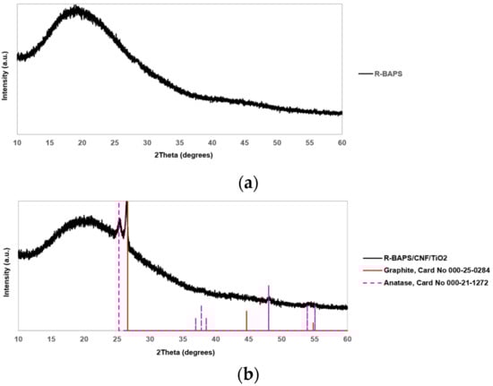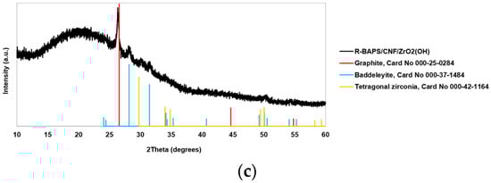 XRD patterns of (a) R-BAPS; (b) R-BAPS/CNF/TiO2; and (c) R-BAPS/CNF/ZrO2(OH) nanocomposites.
