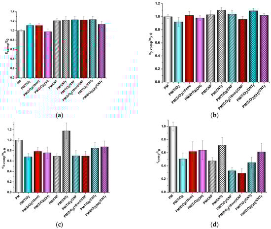 The effect of nanoparticles on the mechanical characteristics of PMDA-ODA (abbreviated as “PM” in the X-axis caption). (a) Young’s modulus, (b) yield stress, (c) break stress, (d) elongation at break.