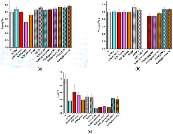 The effect of nanoparticles on the mechanical characteristics of R-BAPS (abbreviated as “R” in the X-axis caption). (a) Young’s modulus, (b) yield stress, (c) elongation at break.