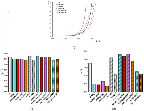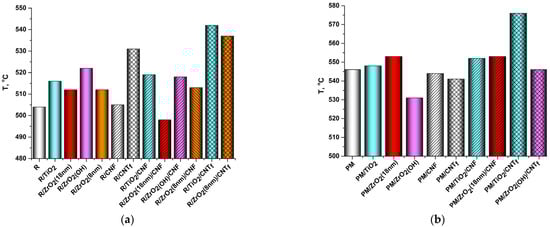 The introduction of binary nanofillers into the PI matrices causes the enhancement of their thermal stability, which becomes predominantly even higher than those of the corresponding single-component nanocomposites. The most pronounced effect was observed in the nanocomposites filled with the TiO2/CNTf combination, whose τ10 were augmented by more than 30 °C compared with these values for the pristine R-BAPS and PMDA-ODA matrices.