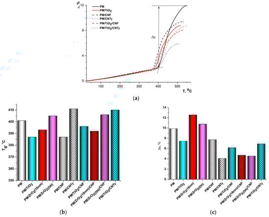 It is seen from Figure 10a that the pristine PMDA-ODA was stretched quite strongly above the Tg. When the temperature reached ~440 °C the deformation rate decreased, signaling an initial stage of the polymer thermal degradation accompanied with the formation of destruction crosslinks. The crosslinks are likely to stiffen the material in this temperature region [67,71]. To assess the rigidity of the samples above the Tg, we determined a value of deformation in the temperature range between the Tg and a temperature of maximum deformation on the TMA curves, Δε (Figure 10c). Obviously, MO nanoparticles affect the Δε value of the nanocomposites diversely, the rigidity of the materials depending on the type, size, and concentration of the nanospecies. Generally, the increase in Δε value is observed when either the size or concentration of the MO nanoparticles is augmented, since more aggregates preventing polymer–polymer interactions are formed and more flexible behavior in PMDA-ODA-based nanocomposites is demonstrated after glass transition [58]. As concerns the nanocomposites filled with nanocarbon (either CNTf or CNF), the Δε value was registered to drop against the host PMDA-ODA. The network of 1D carbon nanoparticles is presumed to contribute to the crosslinking at elevated temperatures and impede the motion of macromolecular segments [54]. Filling PMDA-ODA with binary MO/nanocarbon mixtures resulted in a rise in its stiffness compared with the corresponding nanocomposites with single MO nanofillers, implying that it is the nanocarbon network that ensures low Δε values of such materials.