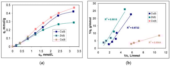 The increase in the initial concentration of metal ions (c0, mmol/L) causes an increase in the values of the sorption capacity (q, mmol/g) for the entire studied concentration range and for all metal ions (Figure 5a). Such a variation is characteristic of sorption processes [20,21] and is due to the fact that, with the increase in the initial concentration, more and more metal ions reached the surface of the sorbent, where they interact with the superficial functional groups and are retained. Thus, according to the experimental data presented in Figure 5a, increasing the initial metal ion concentration from 0.2 to 3.2 mmol/L leads to an increase in the sorption capacity from 0.01 to 0.42 mmol/g in the case of Cu(II), from 0.02 to 0.29 mmol/g in the case of Zn(II) and from 0.04 to 0.47 mmol/g in the case of Co(II). In this concentration range, the removal percents varied between 29 and 78% for Cu(II), 42 and 65% for Zn(II) and 54 and 91% for Co(II) (data not shown).
