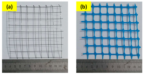 Reinforcing mesh used in ferrocement panels: (a) PVC plastic mesh and (b) iron welded mesh.